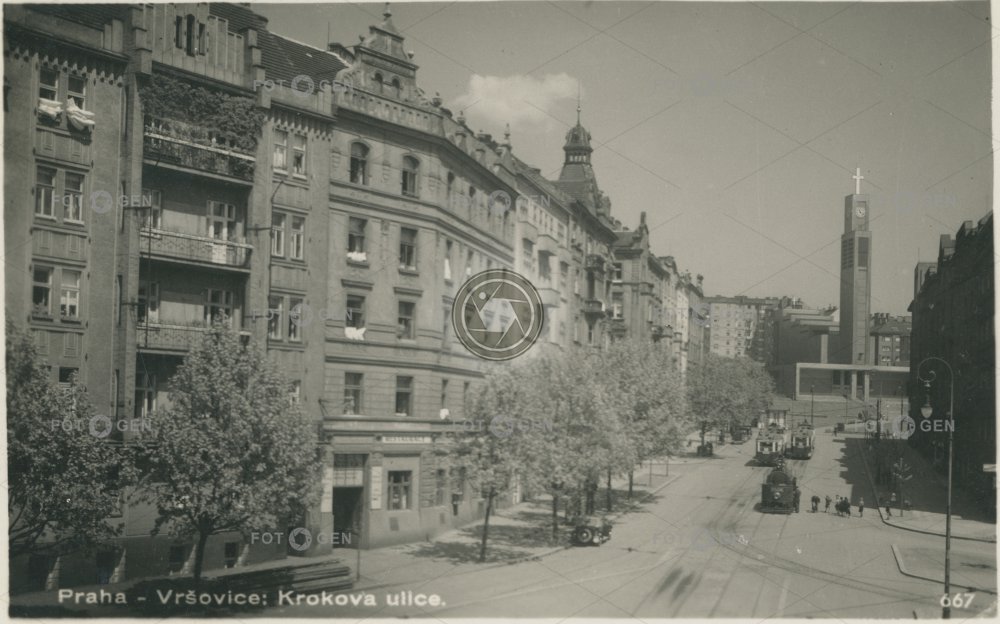 1939 clock hodiny chrám church kostel Krokova Minská místopis pouliční lampa Prague Praha street lamp svatý Václav temple topography Vršovice