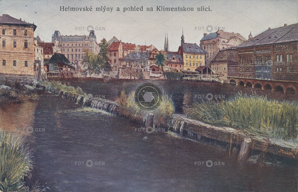 1915 artist barevná color colored drawing Freundův Helmovské J. Minařík Klimentská kolorovaná kresba Kubešův malba malíř mill místopis mlýn Mlynářská New Town Nové Město painter painting Prag Prague Praha river řeka Špačkův topography ulice Vltava