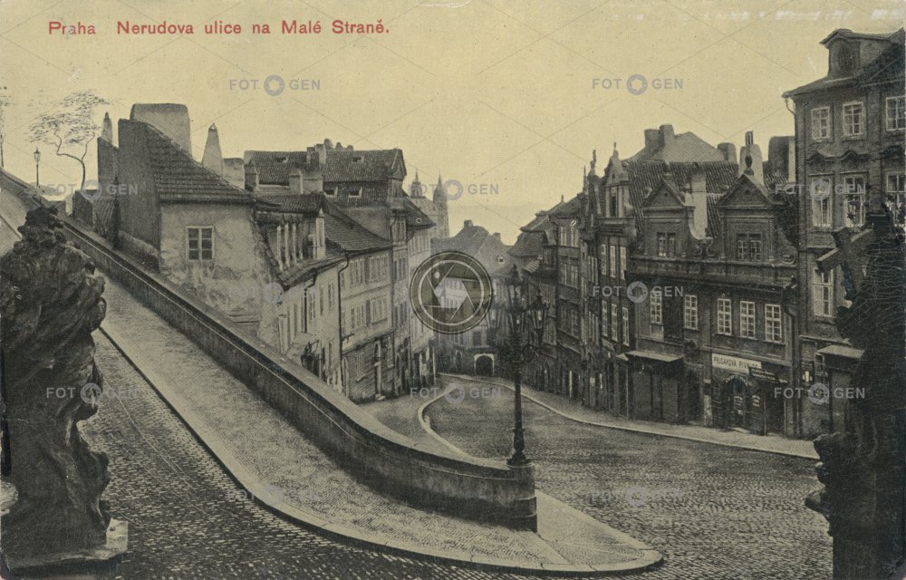 1910 dům Ke hradu King's path Königsweg Královská cesta Lesser Town Malá Strana místopis Nerudova pouliční lampa pouliční osvětlení Prague Praha socha statue street lamp sv. Jan Nepomucký topography U tří červených křížků ulice Úvoz