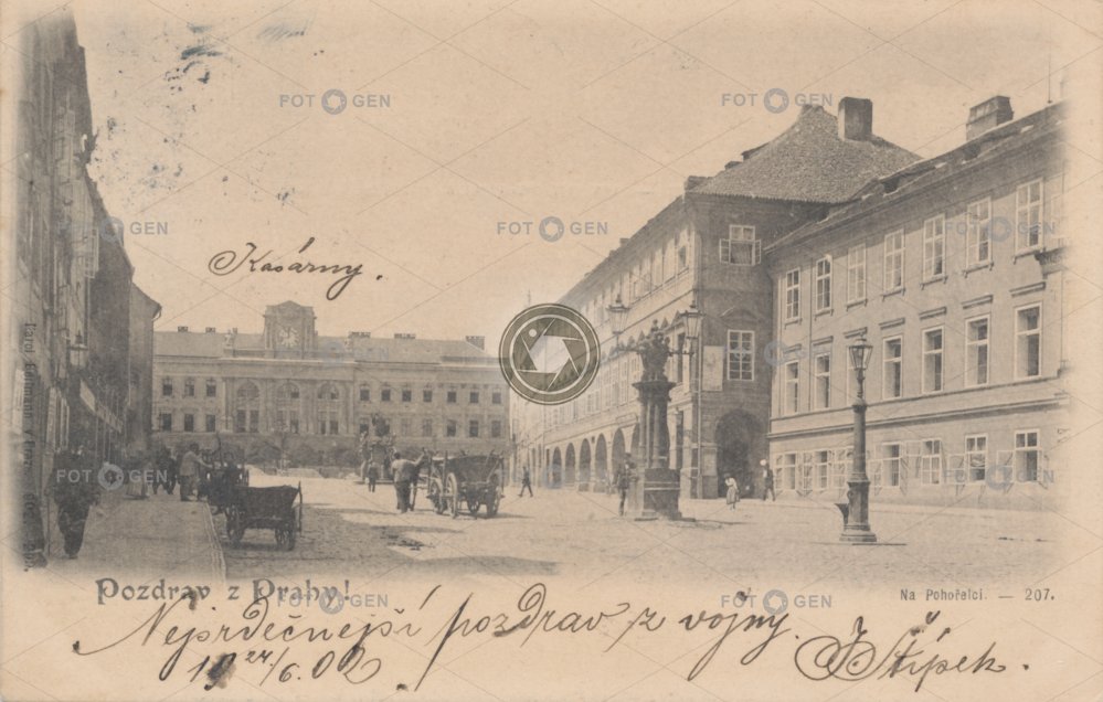alive Hradčany kandelábr Karel Bellmann kasárny koňská vlečka lamppost místopis Na Pohořelci Pohořelec pouliční lampa pouliční osvětlení povoz Prague Praha street lamp topography změbranské živá