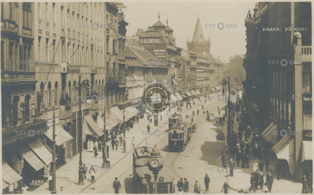 1923 alive borderline clock Golden Cross hodiny místopis Na Příkopě Na Příkopech Nové Město Old Town pouliční hodiny pouliční ruch Prague Praha Příkopy rozhraní Staré Město street clock street traffic the New Town topography tram tramvaj Václavák Václavské náměstí Ve starých alejích vila Richter Wenceslas Square Zlatý kříž živá