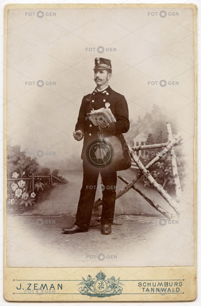 ateliér bag brašna cap čepice dopis knapsack letter malované pozadí painted background portrait portrét post Postman pošta pošťák poštovní doručovatel práce Tanvald tlumok uniform uniforma work
