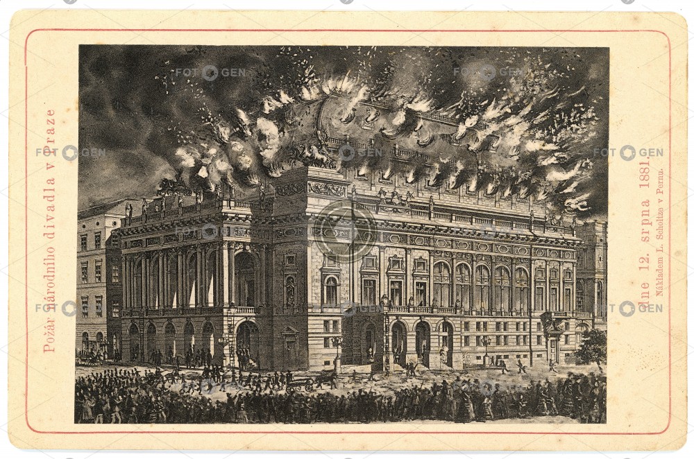 Požár Národního divadla v Praze, 12. 8.1881, reprodukce litografie na kabinetce Autor: Neznámý
