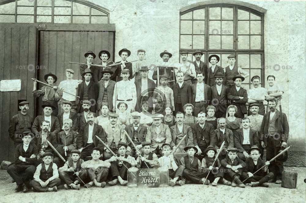 apprentices cap čepice Červený Hrádek dvůr employment factory glass glassmakers Glassworks hat livelihood obživa klobouk Pilsen píšťaly Plzeň portrait portrét práce pracovní kolektiv sklárna skláři sklo továrna učňové whistles work working collective yard zaměstnání