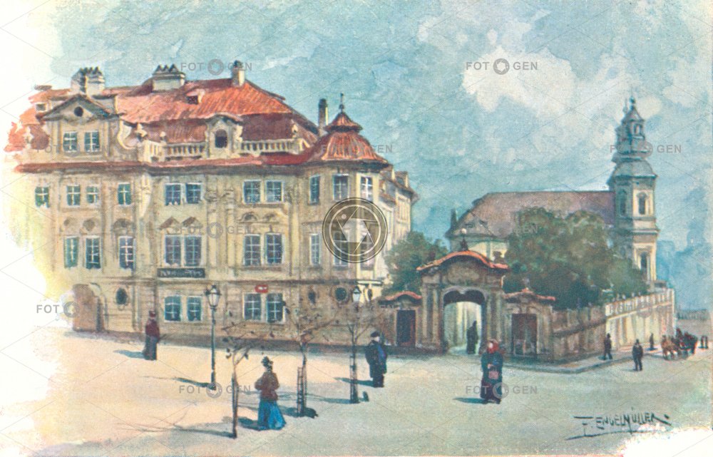 akvarel art barevná baroko brána castle Steps colored Faustův dům Ferdinand Engelmüller gate Hradčany Charles square Karlovo náměstí kresba Lesser Town Malá Strana malba místopis Mladotovský palác New Town Nové Město obraz Picture Prag Prague Praha topography umění Watercolor painting Zámecké schody