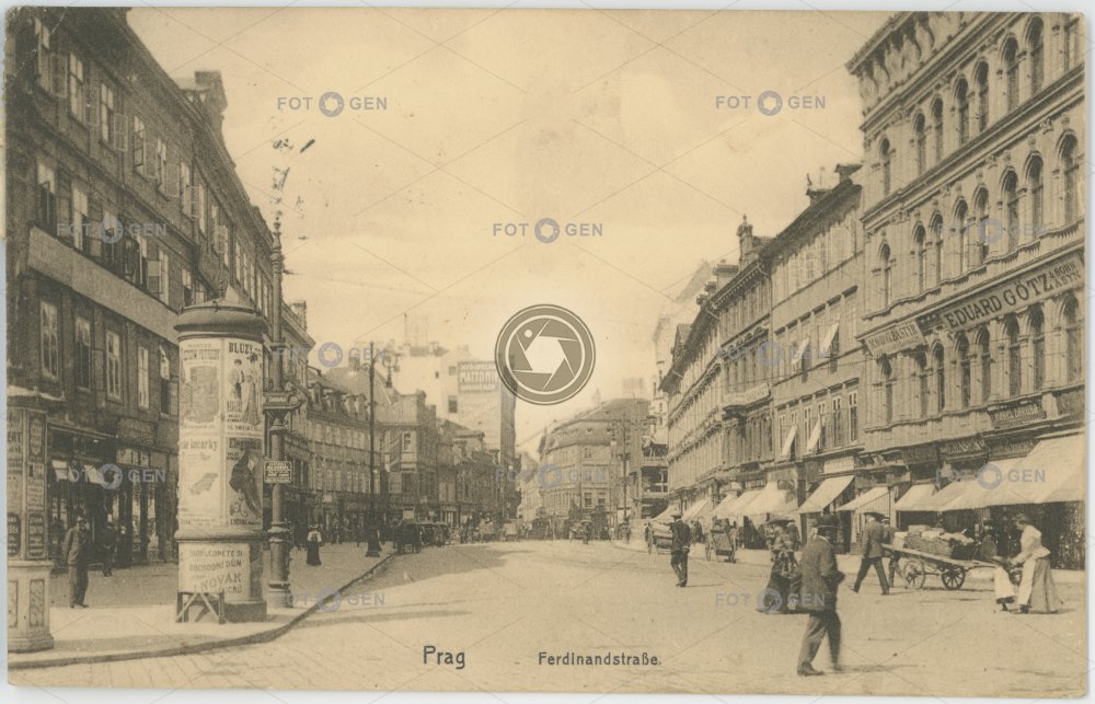 1913 advertising column alive Ferdinandova handcart místopis Národní pouliční ruch Prague Praha reklamní sloup ruční vozík street traffic topography živá