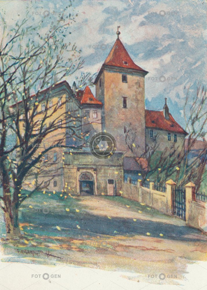 akvarel art barevná brána castle Steps colored Černá věž Ferdinand Engelmüller gate Hradčany kresba Lesser Town Malá Strana malba místopis obraz Picture Prag Prague Praha topography tower umění věž vchod vstup Watercolor painting Zámecké schody