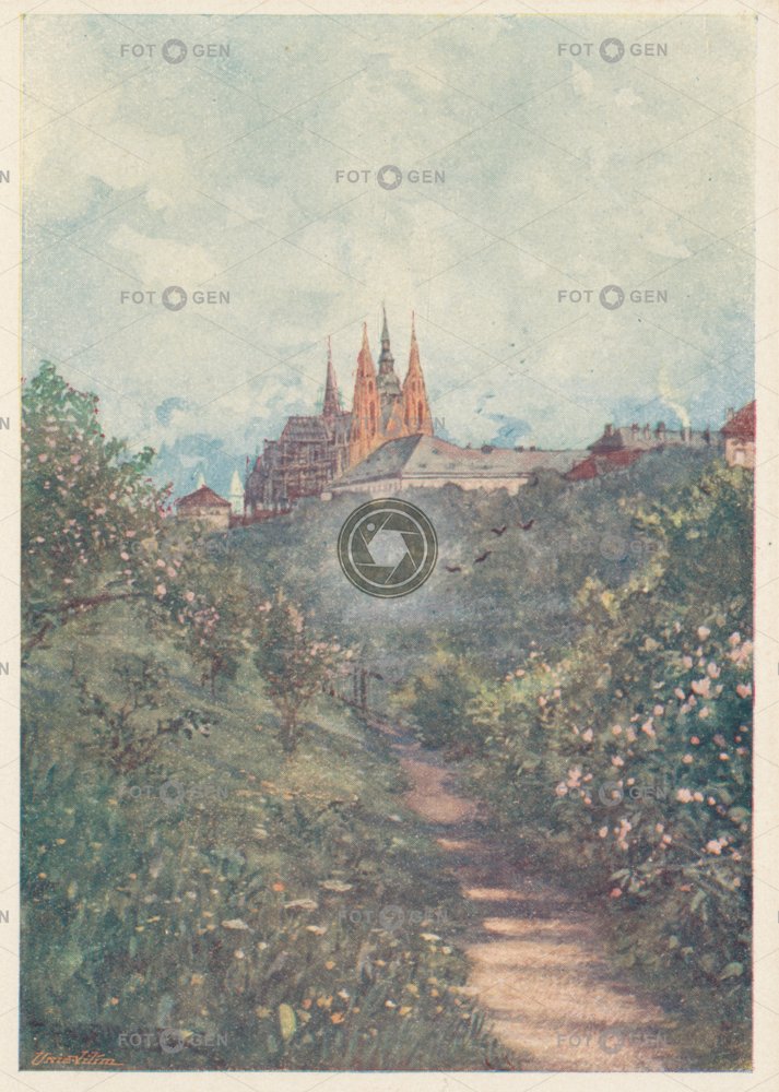 akvarel art barevná castle Steps colored Deer moat der Hirschgraben Ferdinand Engelmüller Hradčany Jelení příkop kresba Lesser Town Malá Strana malba místopis obraz old Picture Prag Prague Prague Castle Praha Pražský hrad stará staré topography umění Watercolor painting Zámecké schody