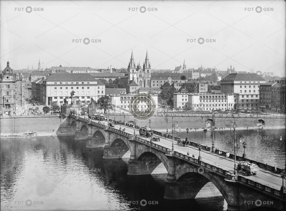 bird's eye view embankment Emmaus monastery klášter Emauzy monastery monument most nábřeží New Building New Town Nové Město novostavba Palackého most Palacký Palacky bridge Pod Slovany pomník pouliční ruch Prague Praha ptačí perspektiva river řeka street traffic tram tramvaj Vltava
