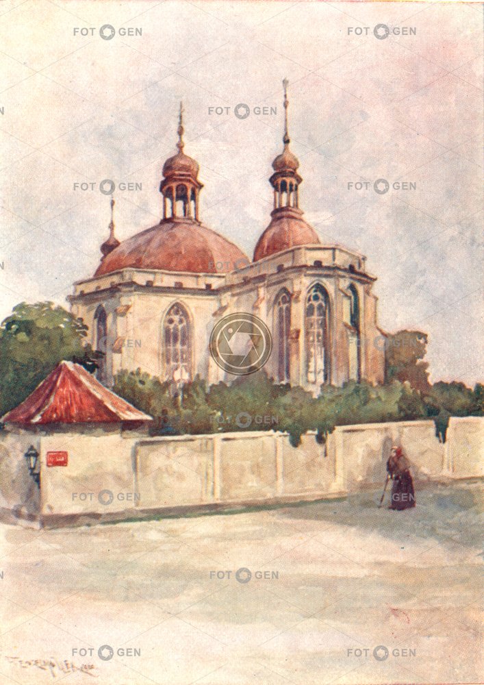 akvarel art barevná castle Steps colored Ferdinand Engelmüller Hradčany chrám church Karlov Kirche kościół kostel kresba Lesser Town Malá Strana malba místopis Nanebevzetí Panny Marie a svat New Town Nové Město obraz Picture Prag Prague Praha temple topography umění Watercolor painting Zámecké schody