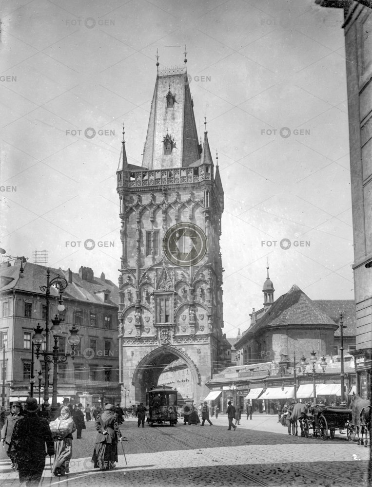 crossroads doprava horse tram church koňka kostel křižovatka pouliční ruch Powder Tower Prague Praha Prašná brána street traffic sv. Vojtěch transport