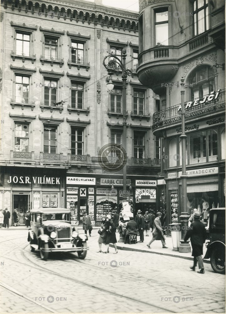 auto car corner crossroads křižovatka nároží obchod Prague Praha ruch shop street traffic ulice Vilímek
