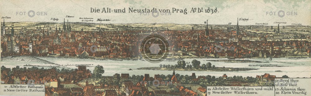 1636 barevná color colored drawing kolorovaná kresba kreslené malba malované místopis New Town Nové Město Old Town painting Prague Praha river řeka Staré Město topography Vltava