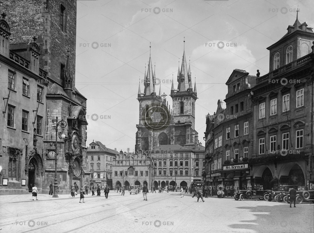 Astronomical Clock auto car Church of Our Lady before Týn náměstí Old Town Square orloj Prague Praha radnice Staroměstské tower town hall Tyn Cathedral Týn School Týnská škola Týnský chrám věž