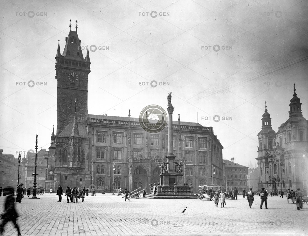 Praha, Staroměstské náměstí, Staroměstská radnice, Mariánský sloup, kostel sv. Mikuláše , kolem 1907
