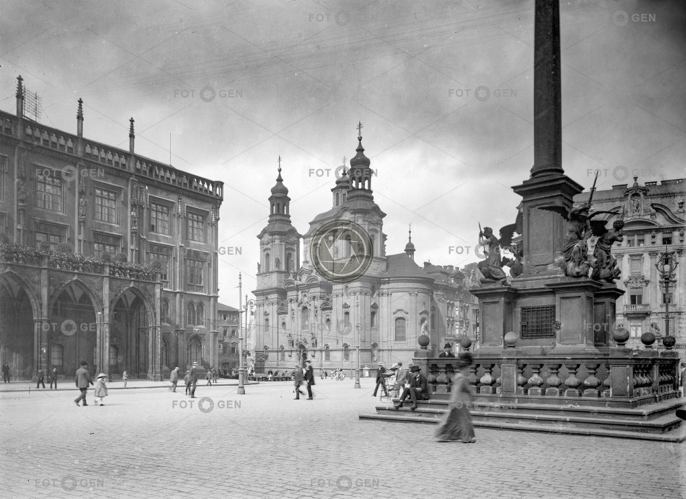 Church of St. St. Nicholas Kostel sv. Mikuláše Marian column Mariánský sloup náměstí Old Town Hall Old Town Square Prague Praha Staroměstská radnice Staroměstské street traffic uliční ruch