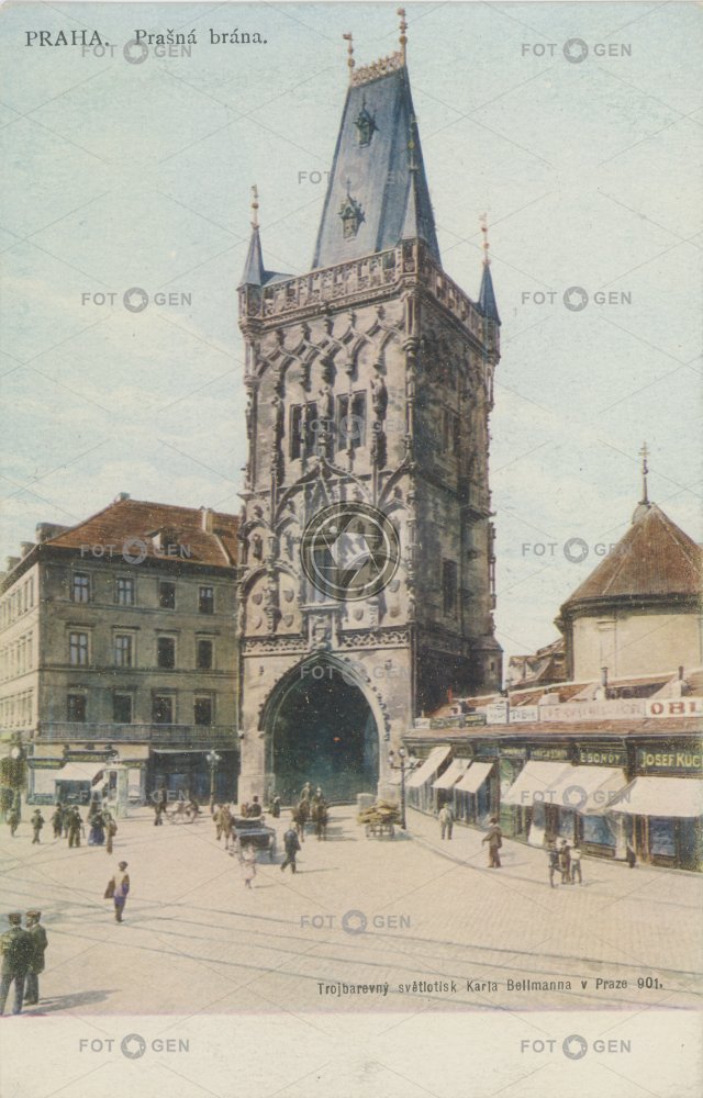 alive barevná colored Gothic gotika kolorovaná kolorovaný světlotisk místopis Old Town Powder gate Powder Tower Prague Praha Prašná brána st. Engelbert Staré Město sv. Vojtěcha světlotisk The Powder Tower topography tower věž živá