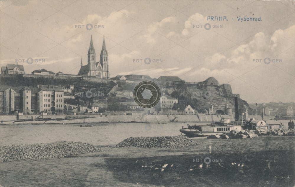 colored hradby hradební věž chrám kolorovaná loď místopis nábřeží opevnění parník Podskalí Prague Praha Rašínovo river řeka skála sv. Petra a Pavla temple topography tunel tunnel Vltava Vyšehrad Vyšehradské
