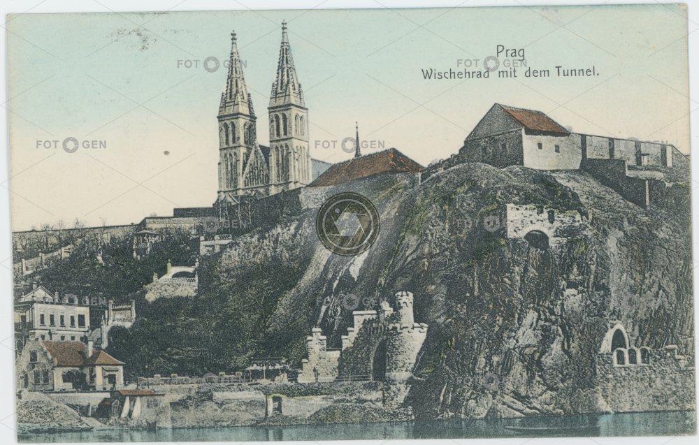 1909 barevná colored chrám sv. Petra a Pavla kolorovaná místopis Prague Praha skála topography tunel tunnel Vltava Vyšehrad