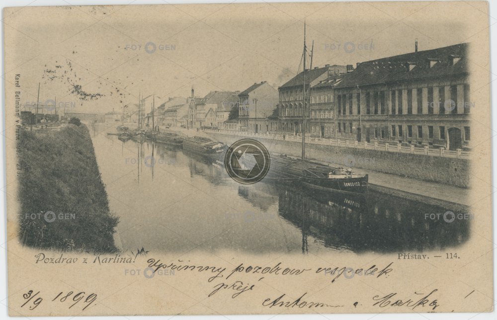 1899 boats doprava harbor Karel Bellmann Karlín loď loďky místopis neexistující neexistující budova neexistující objekt neexistující stavba non-existent non-existent building nonexistent building parník port Prague Praha přístav river řeka ship steamboat topography transport