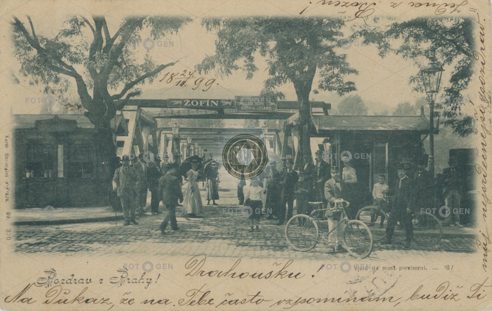 1899 alive Bike bridge cyclist cyklista hat Karel Bellmann klobouk kolo lidé místopis most Old Town parasol people Prague Praha provizorní slunečník Staré Město temporary topography živá Žofín