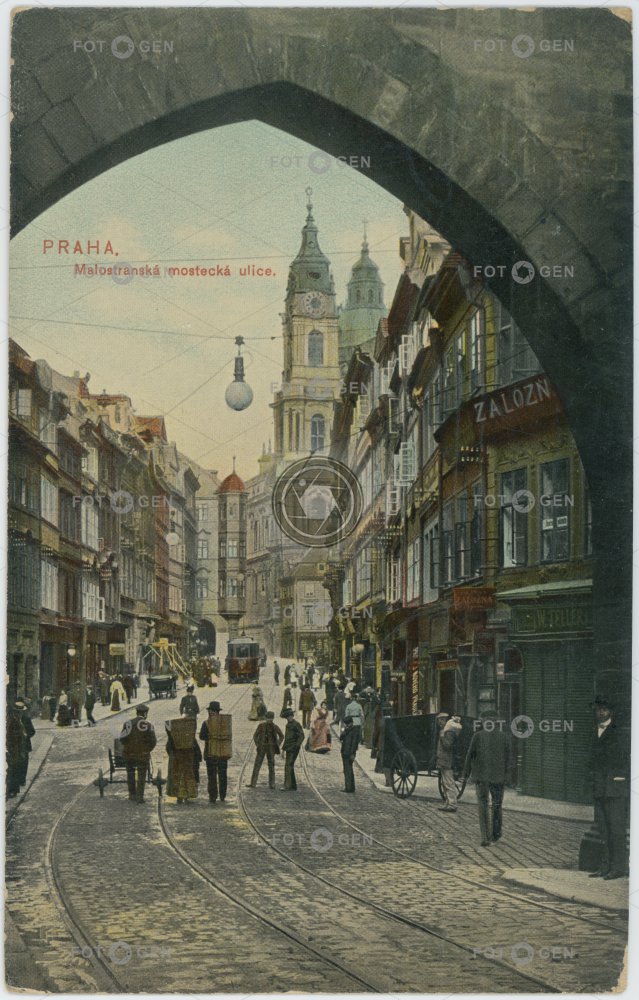1908 belfry brána Bridge Gate colored gate handcart kolorovaná Lesser Town lighting Malá Strana místopis Mostecká Mostecká brána osvětlení pouliční lampa Prague Praha ruční vozík street street lamp svatého Mikuláše topography ulice Ulice k mostu zvonice