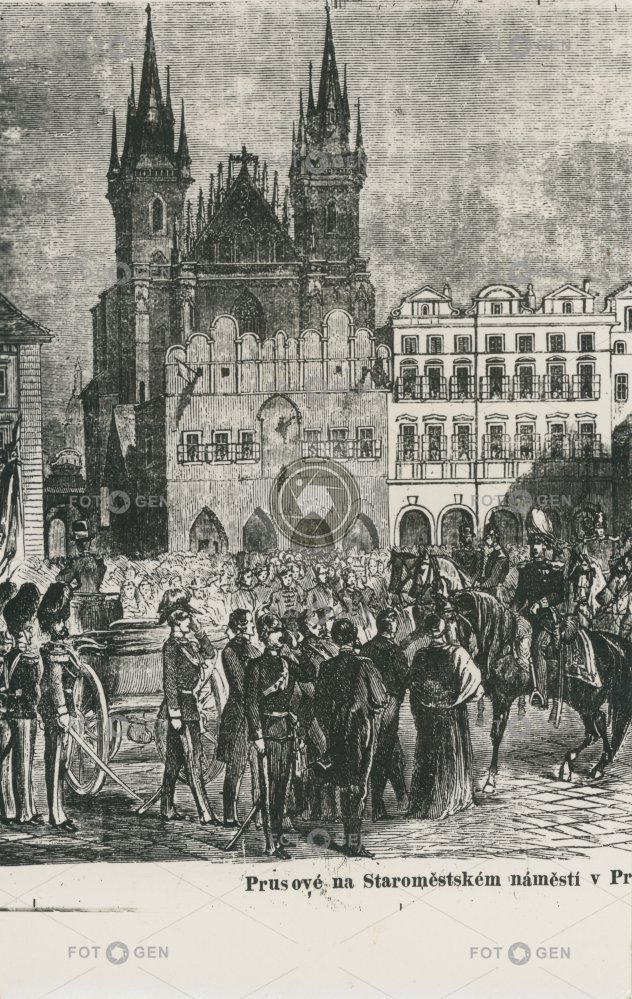 1866 armáda army drawing event Church of Our Lady before Týn Königlich Preußische Armee kostel Kostel Matky Boží před Týnem kresba malba místopis Old Town Old Town Square painting Prague Praha Pruské vojsko Prusko-rakouská válka prusové Soldat soldier Staré Město Staroměstké náměstí topography Týnský chrám událost válka vojáci voják vojna vojsko war