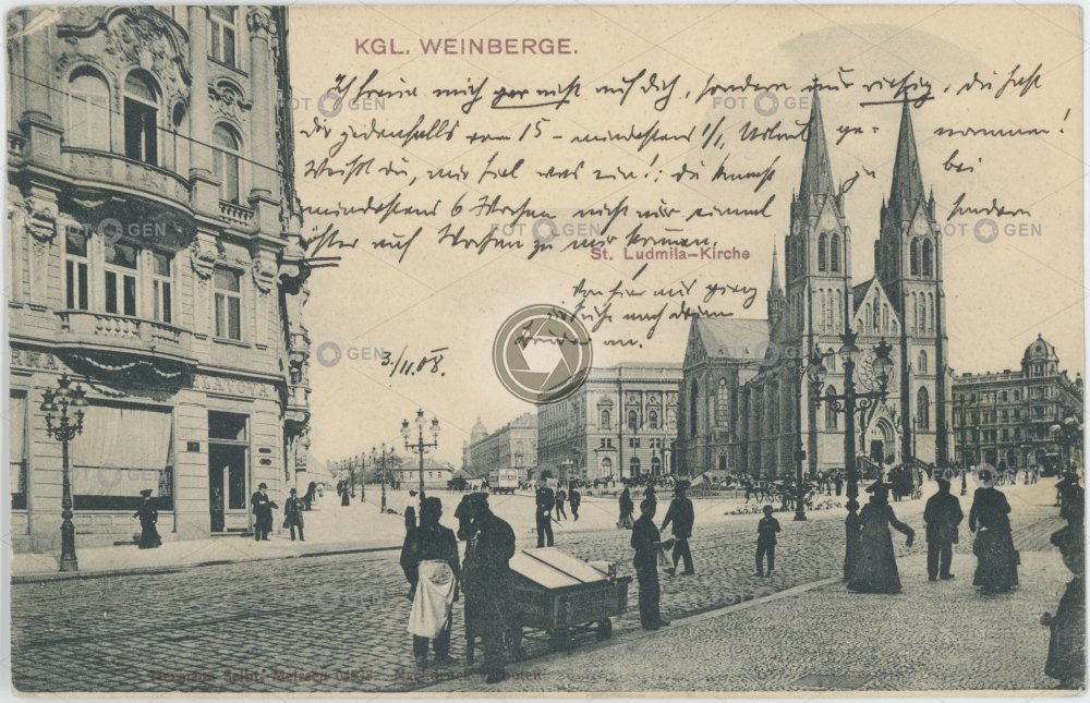 1908 alive chrám church Josef Mocker kostel Královské Vinohrady Míru místopis most Palackého Neo-Gothic novogotika pouliční ruch Prague Praha Purkyňovo náměstí Royal Vineyard Royal Vineyards street traffic sv. Ludmily temple topography ulice Anglická Vinohradské Vinohrady živá