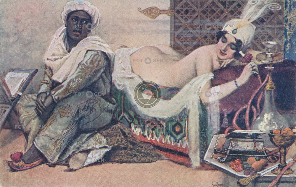 art barevná erotic erotika ethnology eunuch harém Heřmanova kolorovaná kresba kreslená kreslený malba malovaný motivy nahota nudity orient R. Schlosser sexual sexualita tradiční šaty traditional dress umění vodní dýmka water pipe