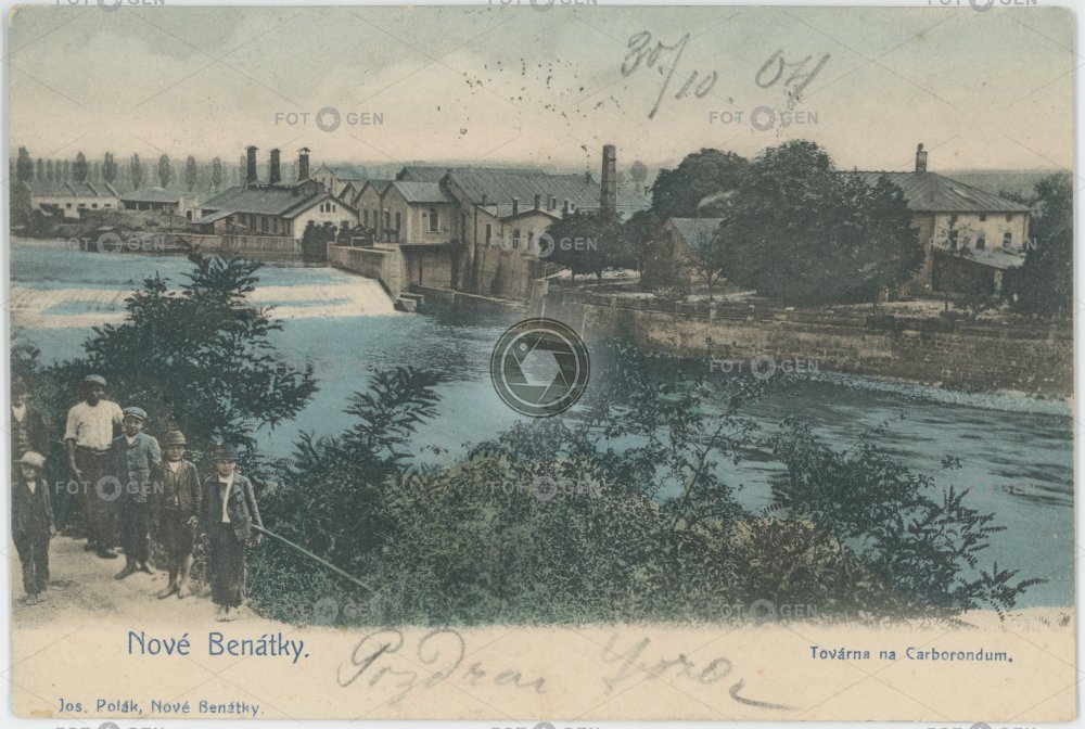 1904 barevná barrage Benátky nad Jizerou carborundum CARBORUNDUM WERKE color colored děti dítě factory child jez Jizera karborundum Kind kolorovaná leisure mill místopis mlýn Nové Benátky river řeka topography továrna volný čas weir