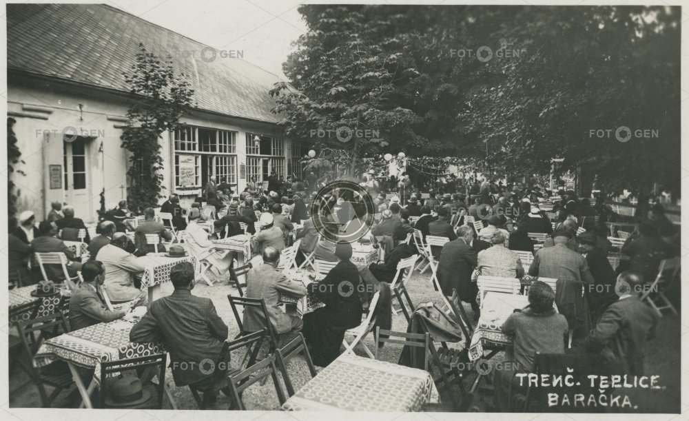 1937 Baračka brasserie custome dancing-hall hospoda host hosté chair leisure letní místopis pivnice pub restaurace restaurant Slovakia Slovensko tančírna topography Trencsénteplic Trenčianske Teplice Trentschin-Teplitz venkovní volný čas zahrádka zahradní zákazník židle