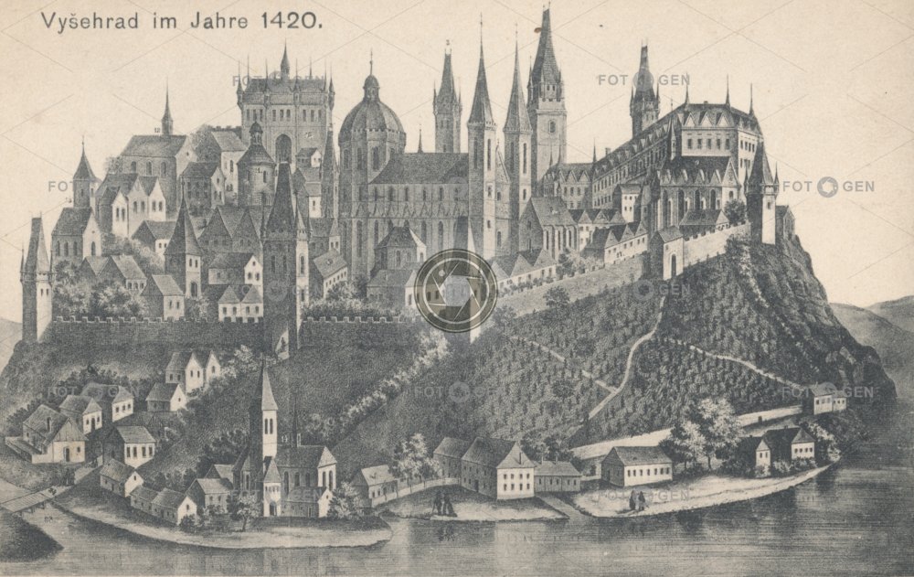 1420 hradby hradební věž lithography litografie místopis old opevnění Pokorný Prague Praha river romance romantizující rotunda řeka sv. Martina topography veduta Vltava Vyšehrad Vyšehradské walls