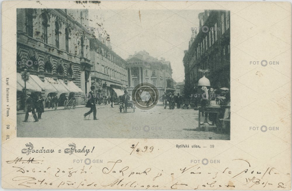 1899 awning barrow divadlo dvoukolák Karel Bellmann markýza místopis Nosticovo Old Town pouliční ruch Prague Praha Rytířská Staré Město Stavovské street traffic theater topography ulice