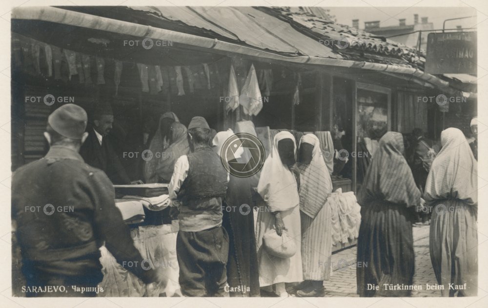 1933 Bosna Bosna a Hercegovina Bosnia Bosnia and Herzegovina burka Čaršija ethnology etnologie Frau Geschäft islám market markets Märkte místopis muslim clothes obchod Sarajevo shop sklep topography trh tržiště tržnice üzlet woman žena ženy