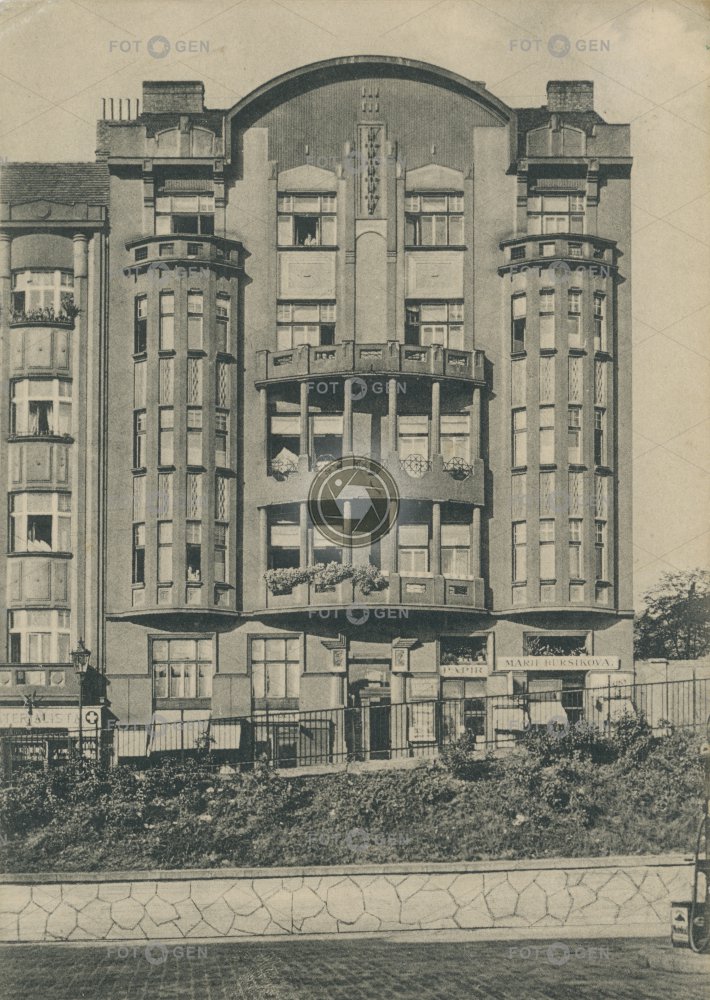 Secesní dům v Praze, kolem roku 1931. Obchod Marie Bursíková. Art Nouveau house in Prague, around 1931. Shop Marie Bursíková
