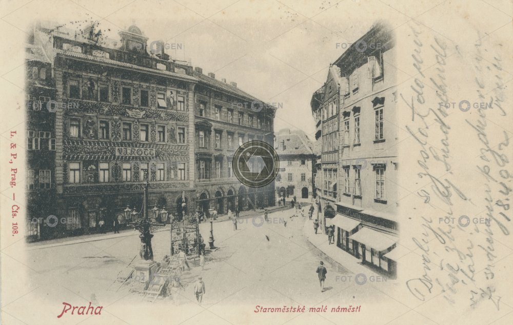 1898 ironmongery kandelábr lamppost Linhartská Malé náměstí Malý ryneček místopis Old Town Prague Praha Rechsiegel sgraffito sgrafita sgrafito Staré Město studna topography U černého beránka U tří bílých růží V. J. Rott well železářství