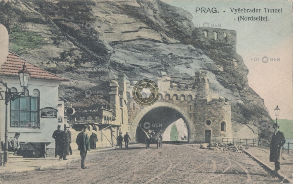 alive barevná celnice cimbuří colored customhouse Hospodářský úřad kolorovaná koňská vlečka místopis nábřeží Podskalí Podskalské policajt policista pouliční osvětlení povoz Prague Praha rock street lamp topography tunel věž výhlídková Vyšehrad Vyšehradské živá