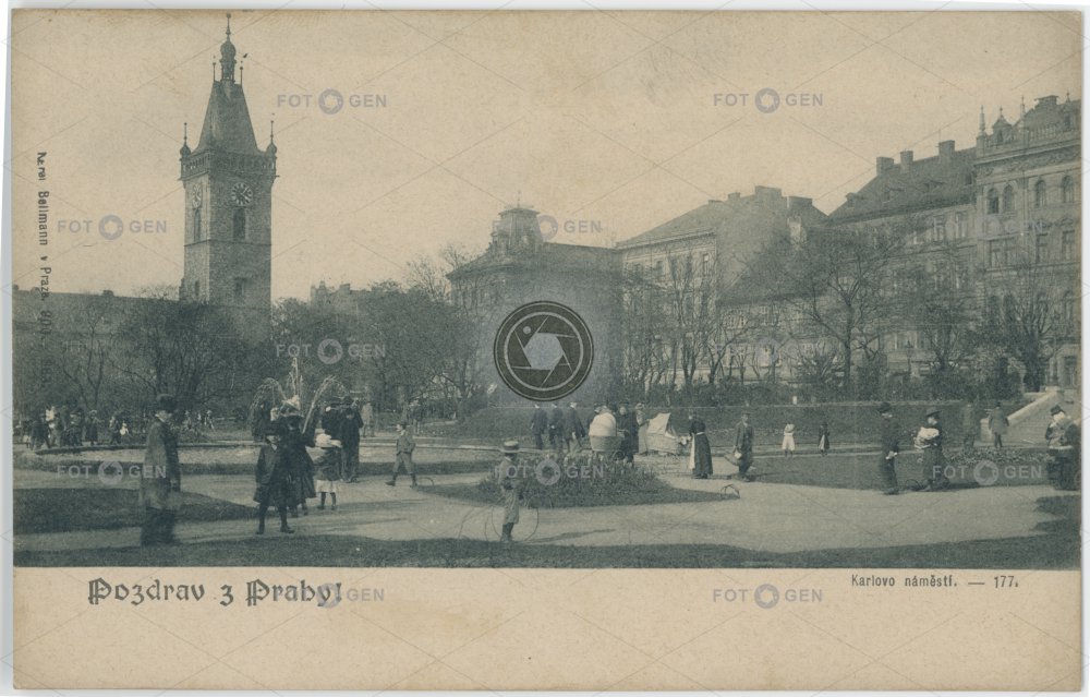 1900 alive baby-carriage belfry clock děti fountain hodiny children Karel Bellmann Karlovo náměstí kašna kočárek místopis park Prague Praha radniční věž topography tower věže zvonice živá