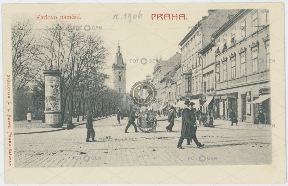 1906 advertising column alive barrow belfry clock dvoukolák handcart hodiny Charles' Square Karlovo náměstí místopis náměstí New Town Nové Město Novoměstská radnice Prague Praha reklamní sloup ruční vozík square topography tower věže zvonice živá