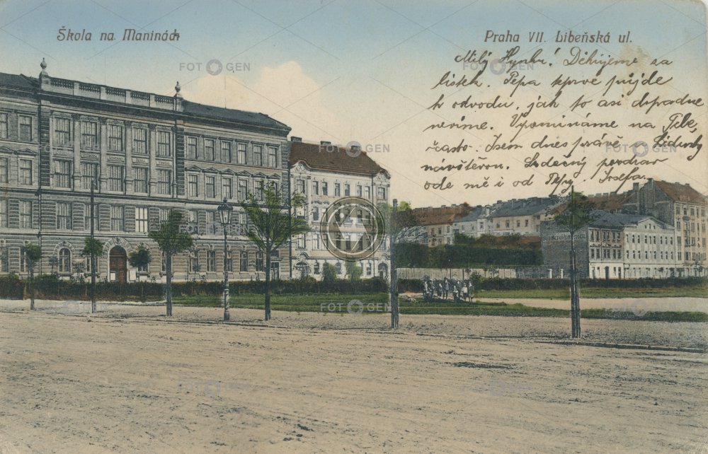 1914 barevná color Holešovice kolorovaná Libeňská Maniny místopis Na Maninách Prague Praha Praha 7 school škola topography