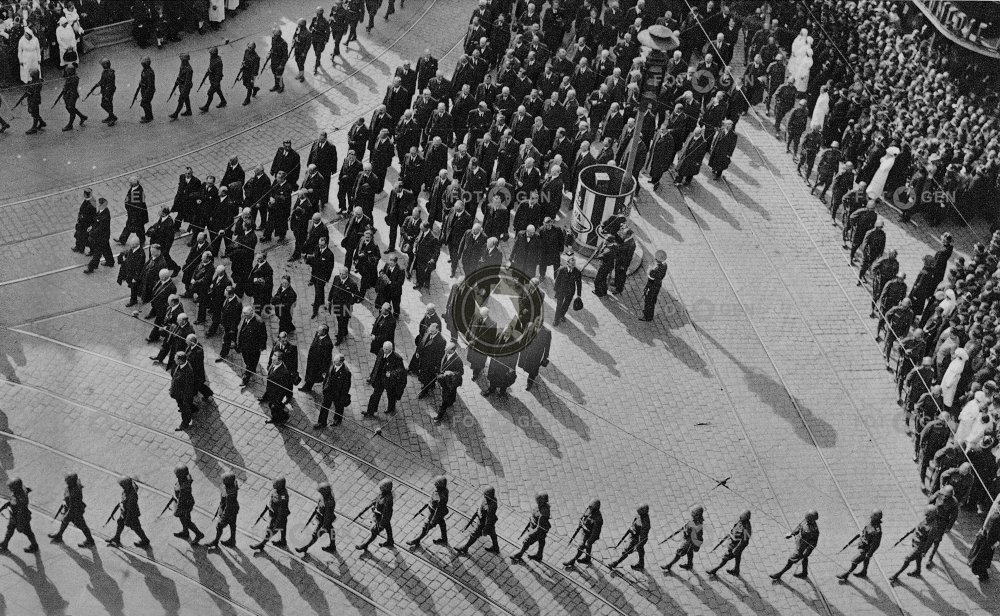 celebrity Československa Československý event kondukt náměstí osobnosti Osvoboditel pohřeb prezident průvod první představitelé smrt smuteční státník T.G. Masaryk tatíček Tomáš Garrigue Masaryk událost Ulice 28. října úmrtí Václavské vláda vojáci voják