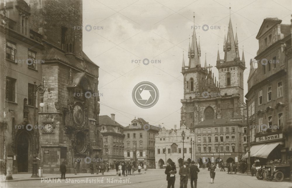 1930 Astronomical Clock auto belfry car clock hodiny church Church of Our Lady before Týn Kirche kostel Kostel Matky Boží před Týnem lidé Menschen místopis Old Town Old Town Hall Old Town Square orloj people pouliční lampa pouliční osvětlení Prague Praha school Staré Město Staroměstké náměstí street lamp škola topography town hall Týn Týnský chrám u Bílého jednorožce U zvonu zvonice
