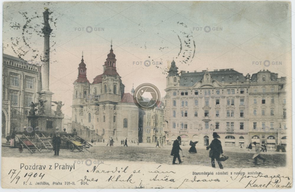 1904 barevná barrow color colored dvoukolák church Kirche kolorovaná kostel kostel svatého Mikuláše Mariánský sloup Mikulášská místopis Old Town Old Town Square Pařížská Prague Praha radnice Staré Město Staroměstké náměstí topography town hall vlečka