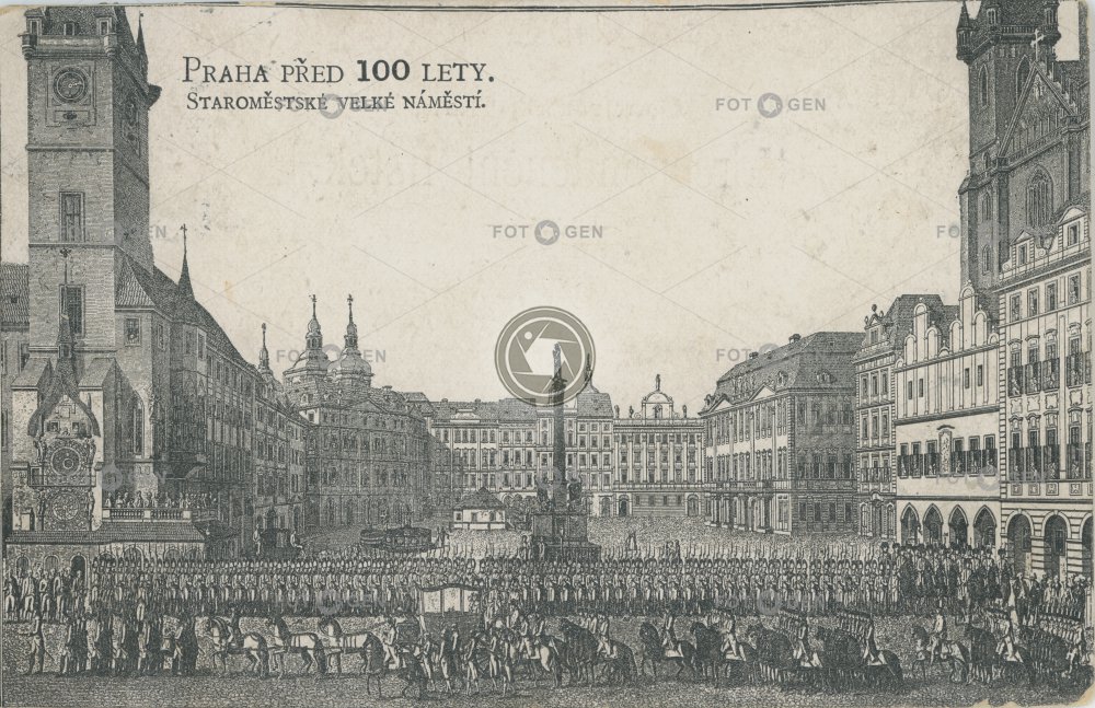 1798 Astronomical Clock drawing event Church of Our Lady before Týn kostel Kostel Matky Boží před Týnem kresba malba místopis Old Town Old Town Square orloj painting Prague Praha radnice Soldat soldier Staré Město Staroměstké náměstí topography town hall Týnský chrám událost vojáci voják vojna