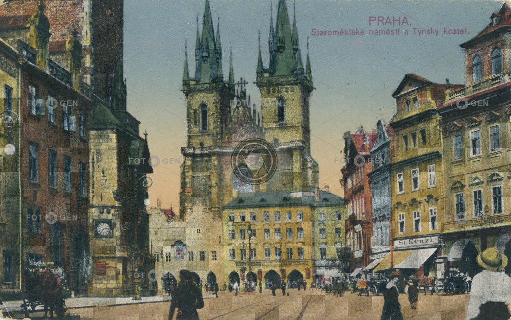 1913 Astronomical Clock barevná colored church kostel Kostel Matky Boží před Týnem Matky Boží před Týnem místopis Old Town Square orloj pouliční lampa Prague Praha Staromák Staroměstké náměstí street lamp topography Týn Týnský chrám