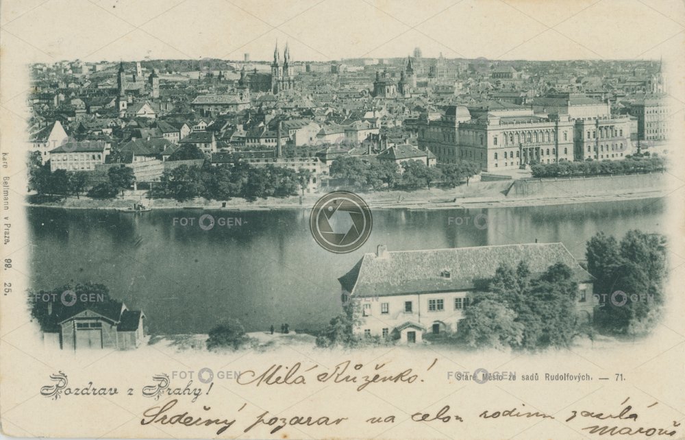1899 celkový Dvořákovo embankment Jewish ghetto Jewish town Josefov Karel Bellmann místopis nábřeží neexistující nonexistent building Old Town panorama panoramatická panoramatický panoramic Prague Praha river Rudolfinum řeka Staré Město topography Vltava židovské ghetto židovské město