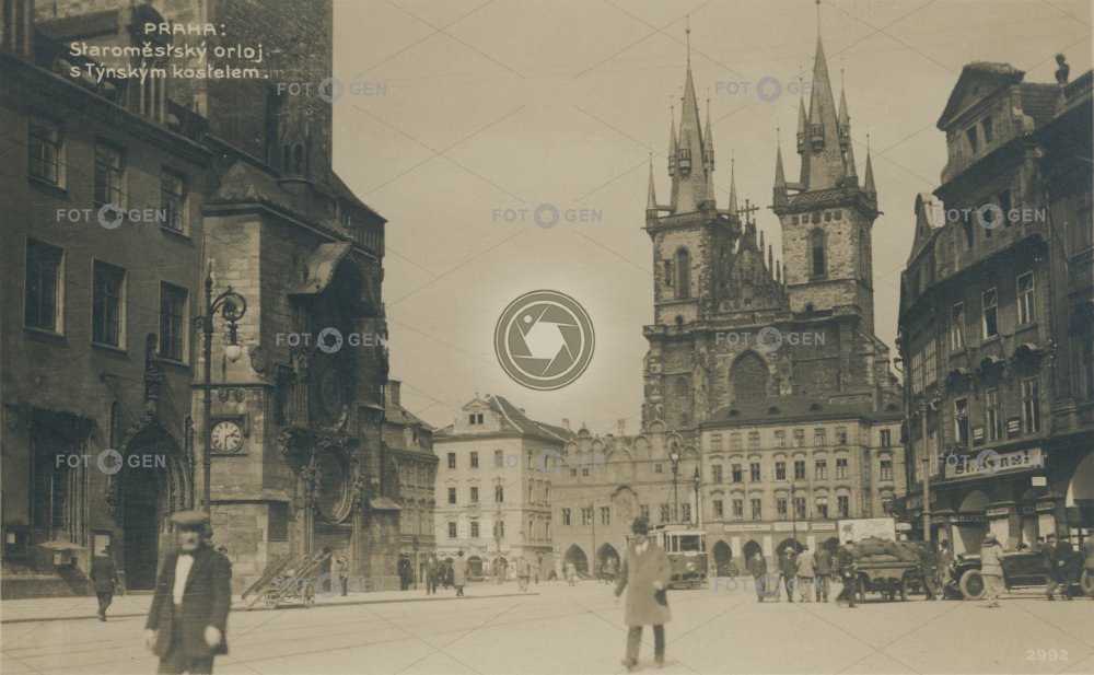 alive Astronomical Clock auto car dvoukolák Church of Our Lady before Týn kostel Kostel Matky Boží před Týnem místopis Old Town Old Town Square orloj pouliční lampa pouliční osvětlení Prague Praha radnice Staré Město Staroměstké náměstí street lamp topography Týnský chrám živá
