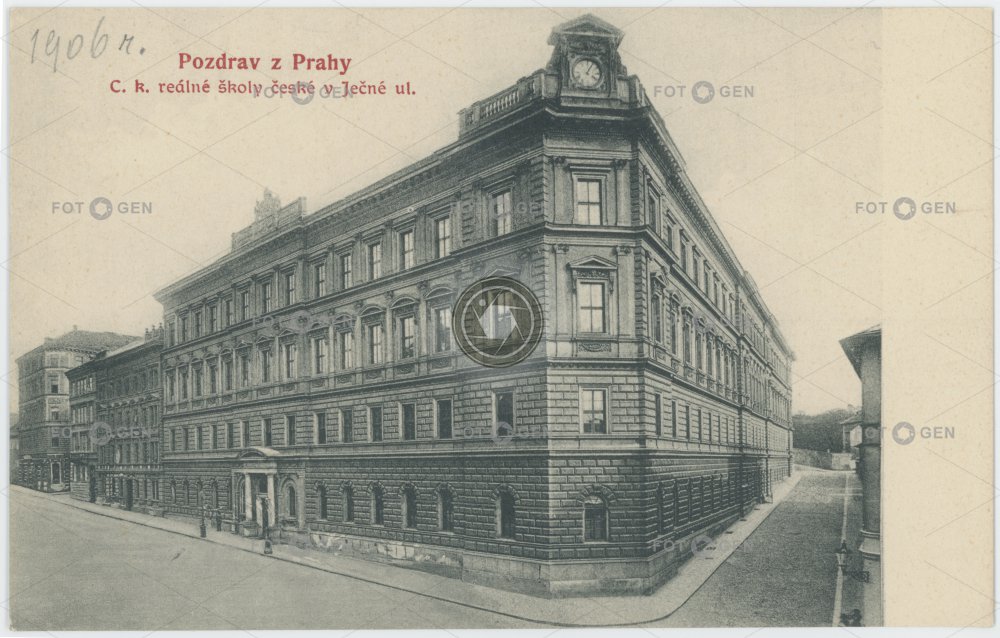 1906 C. k. clock hodiny Ječná Ke Karlovu místopis Neo-Renaissance New Town Nové Město novorenesance Prague Praha reálka secondary school school škola topography