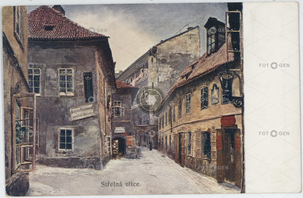 art autotypie barevná colored čtyřbarevná autotypie drawing kolorovaná malba místopis Na Františku neexistující budova nonexistent building Old Town painting Passage polotón Prague Praha průchod Staré Město Střelná topography U Šišlingů ulice Střelná ulička umění