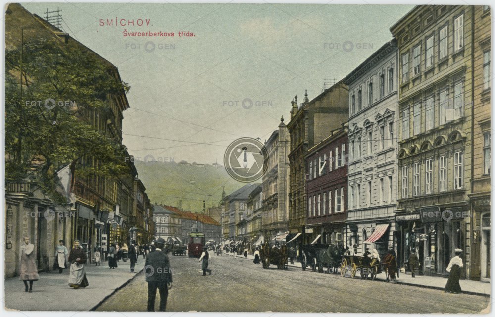 alive barevná color colored horse carriage kolorovaná koňská vlečka místopis nádražní povoz Prag Prague Praha prvorepublikové Smíchov Strassenbahn Švarcenberkova topography tram tramvaj živá